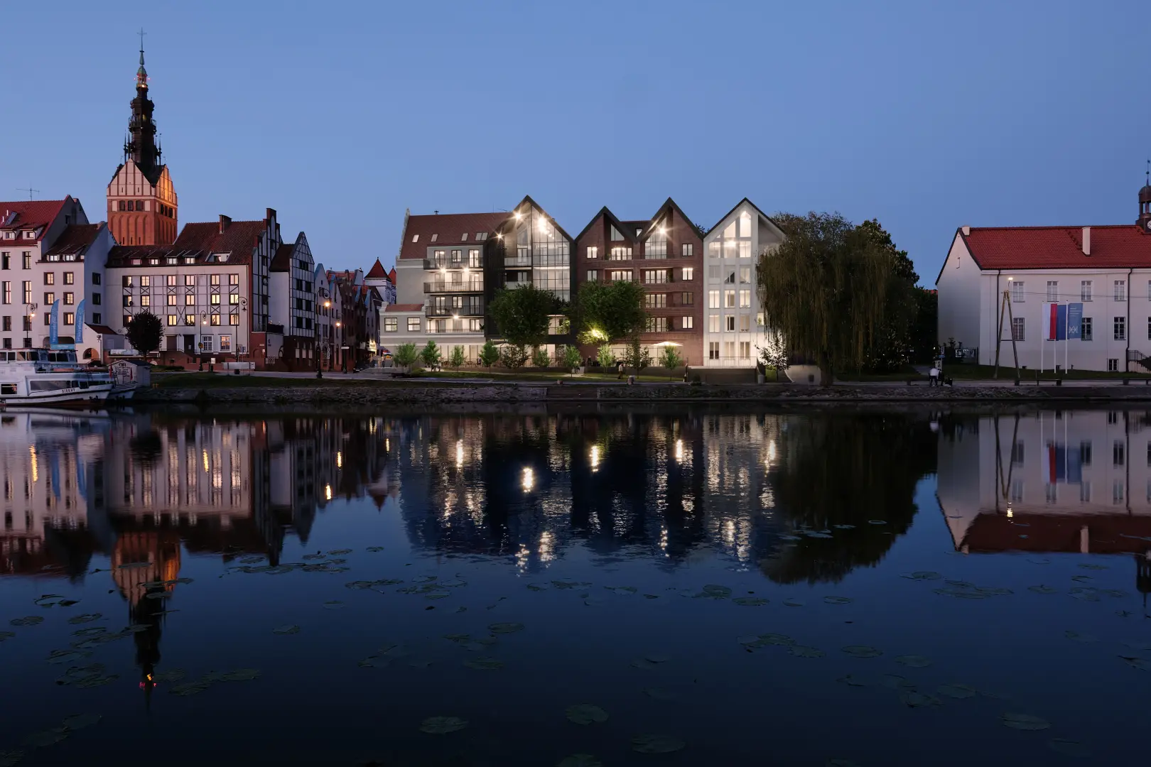 Warto rozważyć inwestycję w apartamenty Promenada nie tylko ze względu na architekturę, ale przede wszystkim lokalizację i otoczenie. Po pierwsze, nieruchomość znajduje się w sercu elbląskiej starówki, bezpośrednio nad rzeką Elbląg i przy odrestaurowanym bulwarze Zygmunta Augusta – idealne miejsce do spacerów i odpoczynku, zwłaszcza po zmroku, gdy nabrzeże rozświetlają liczne światła.